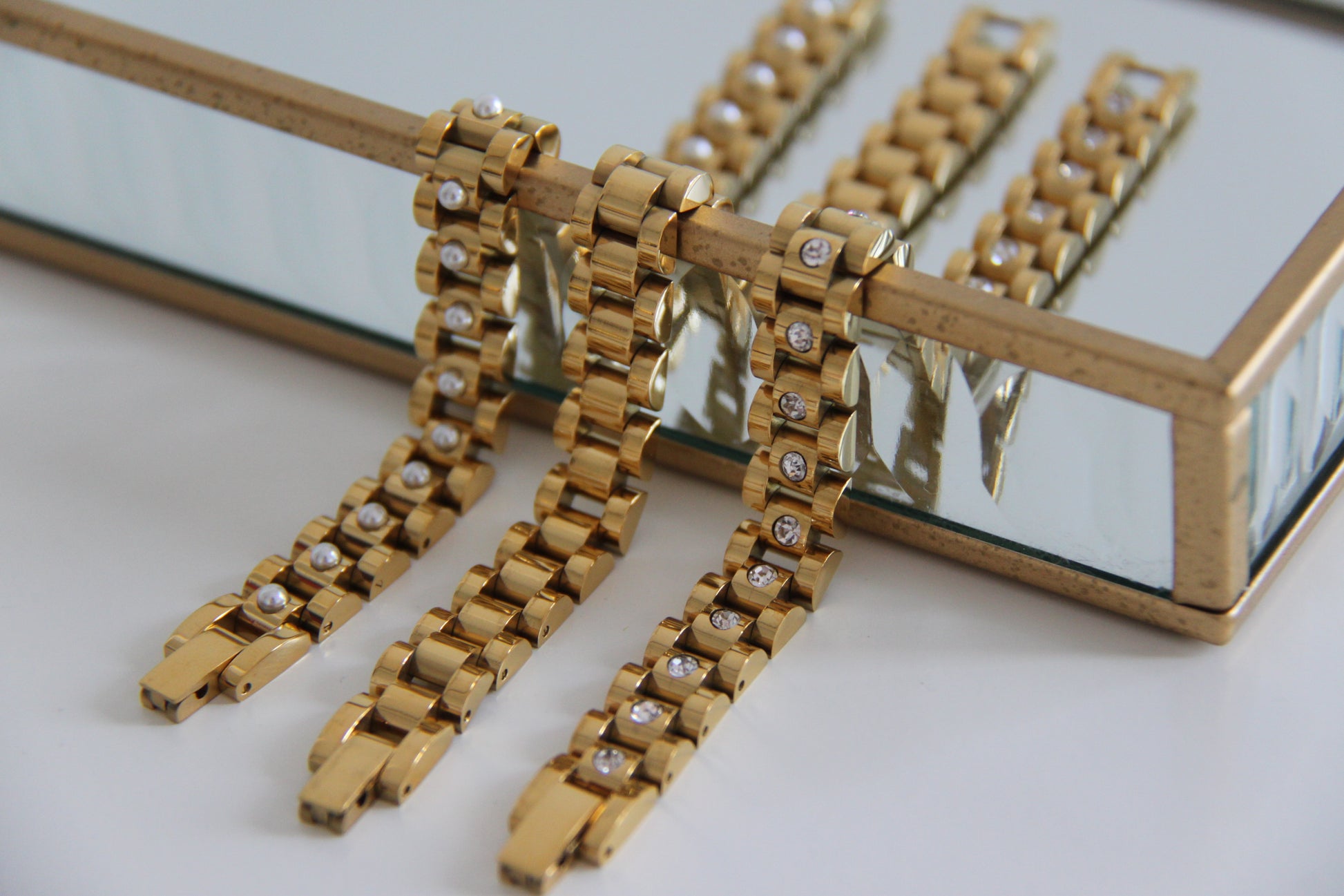 Pulseira em aço inoxidável dourado, ajustável a cada pulso.